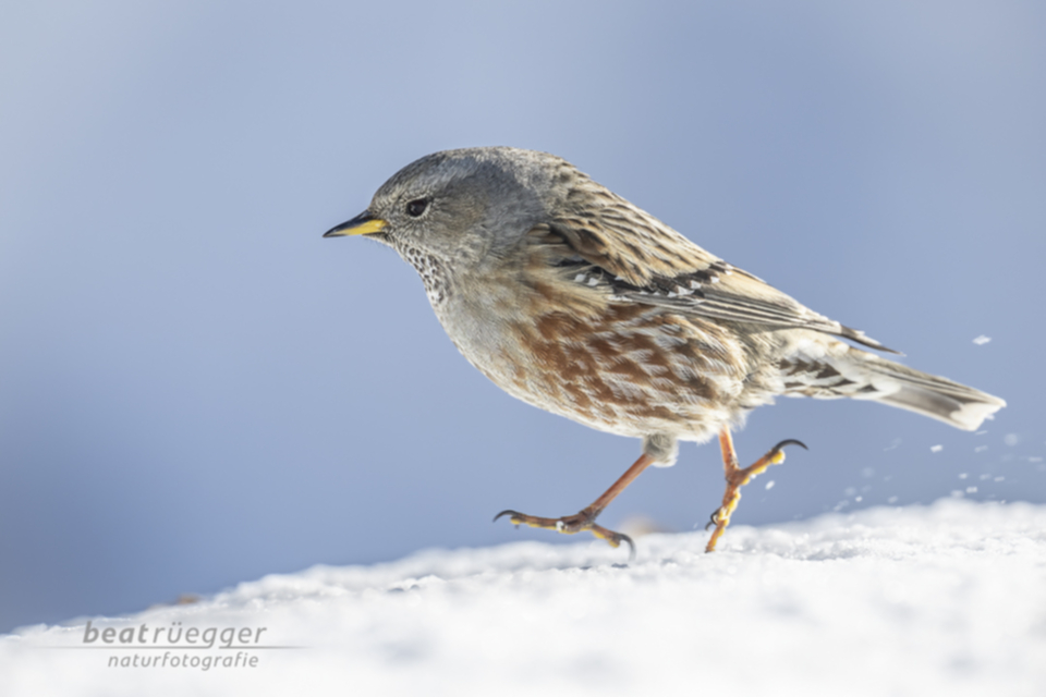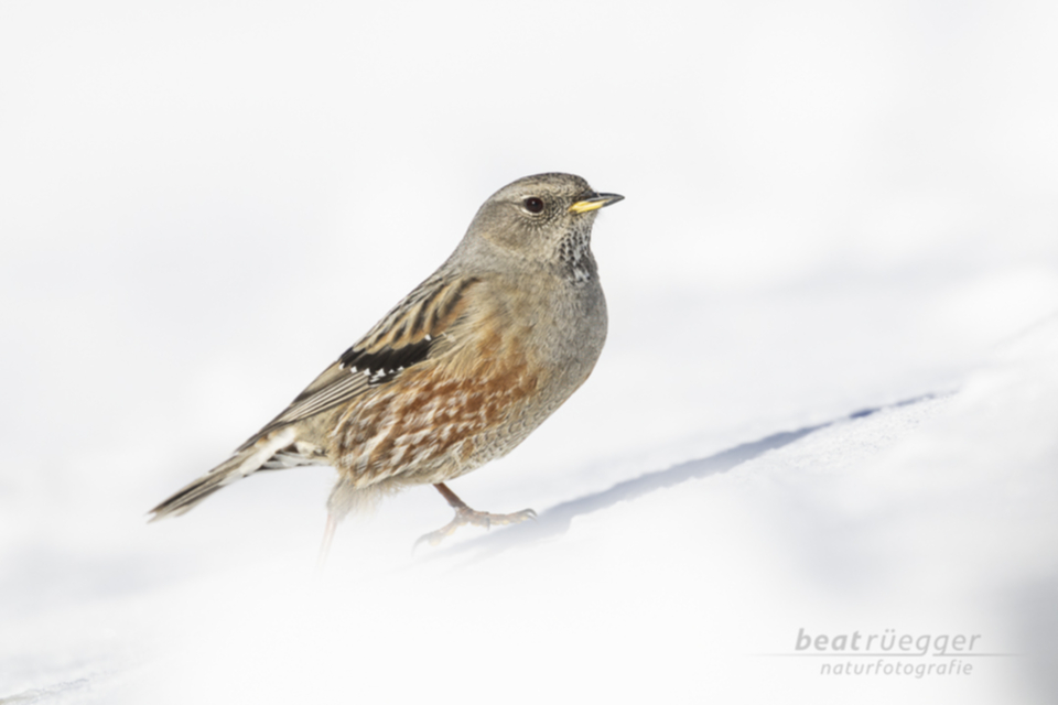 Am 12. Januar brachte die Gondel Adrian, Kilian und mich bei schönstem Wetter auf die Gemmi. Oben standen schon ein gutes Dutzend Fotografen. Stephane, einer von ihnen, meinte, am Vortag wäre 3 Bartgeier rund 10 Mal vorbeigefolgen. Voller Vorfreude machten wir uns bereit. Schon bald tauchten mehrere Alpenbraunelle auf und tummelten sich zwischen unseren Beinen, neben unseren Rucksäcken und pickten ausgelegtes Vogelfutter auf. Ein Schneefink zeigte sich nur kurz, sonst nichts. Auf dem Boden liegend fotografierten wir Braunellen. Die Bise frischte auf. Weit und breit kein Geier, nicht einmal eine Alpendohle. Ein Steinadler kreiste in der Ferne vor dem Daubenhorn.